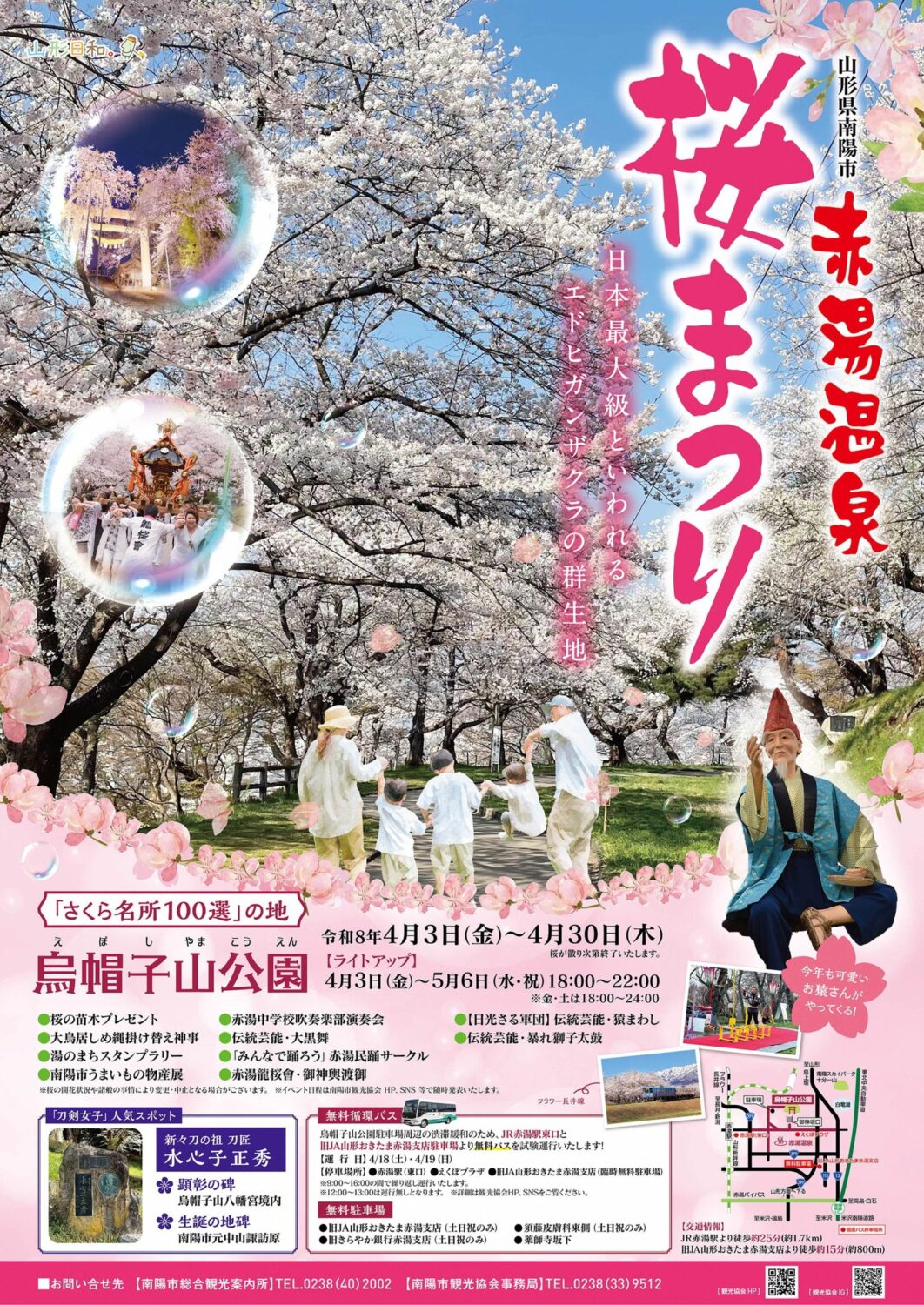 さらに、4月上旬から4月下旬頃まで 山形座 瀧波の桜、烏帽子山公園の桜、置賜桜回廊の古典桜など 賑やかな桜巡りをお楽しみいただけます。